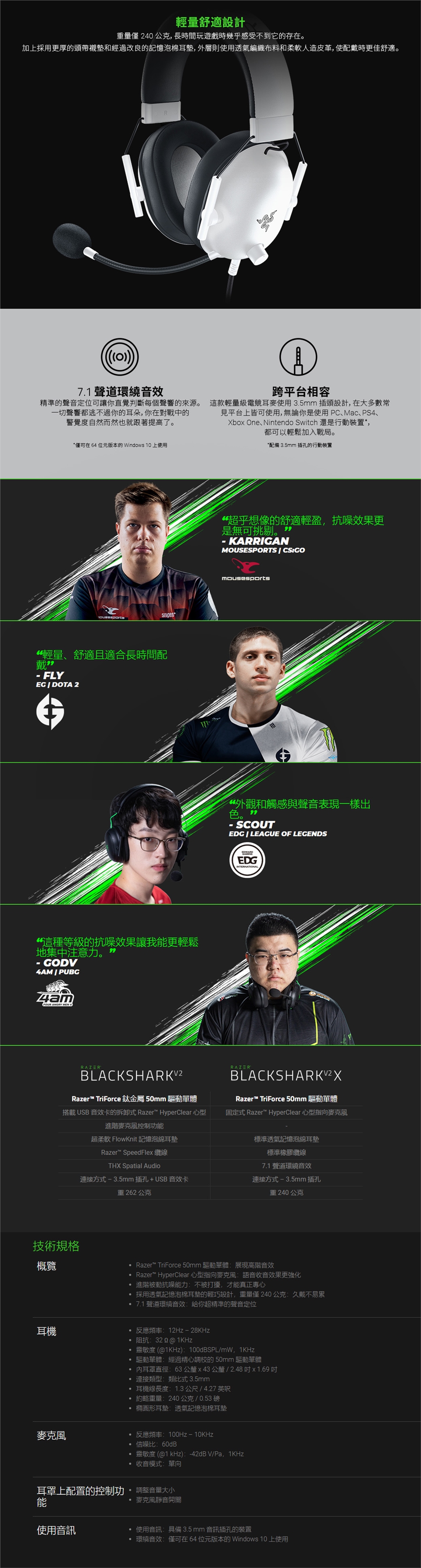 戴上輕量級電競耳麥,正面迎戰對手,在重磅壓力下茁壯成長。為你介紹 Razer BlackShark V2 X — 這款耳麥具有令人驚嘆的音效、通話清晰的麥克風以及完美聲音隔離能力的三重優勢,且經過職業選手們認證。