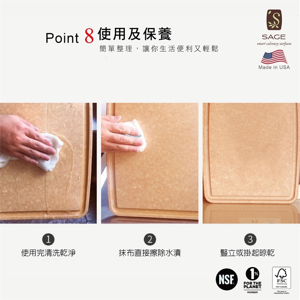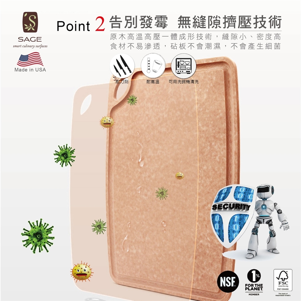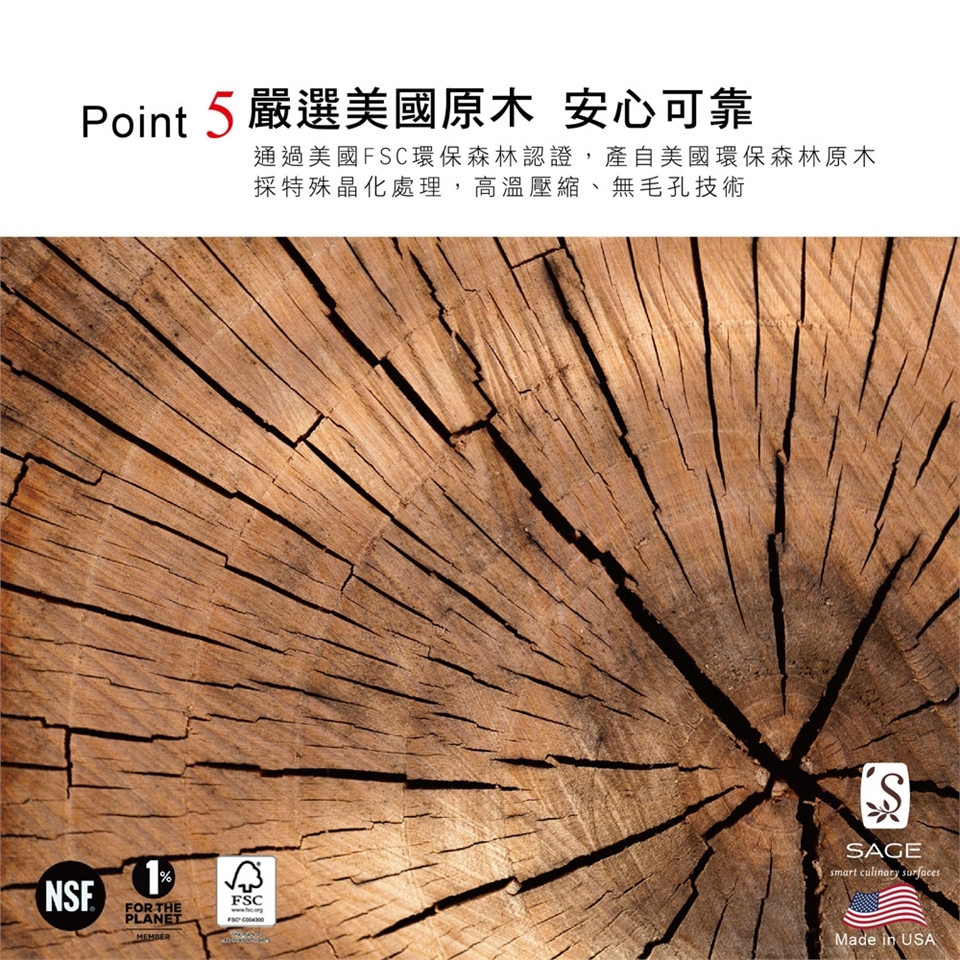 無菌衛生:榮獲NSF商業食品服務業認證,證明產品防霉抗菌,木質密度高,達到衛生與健康