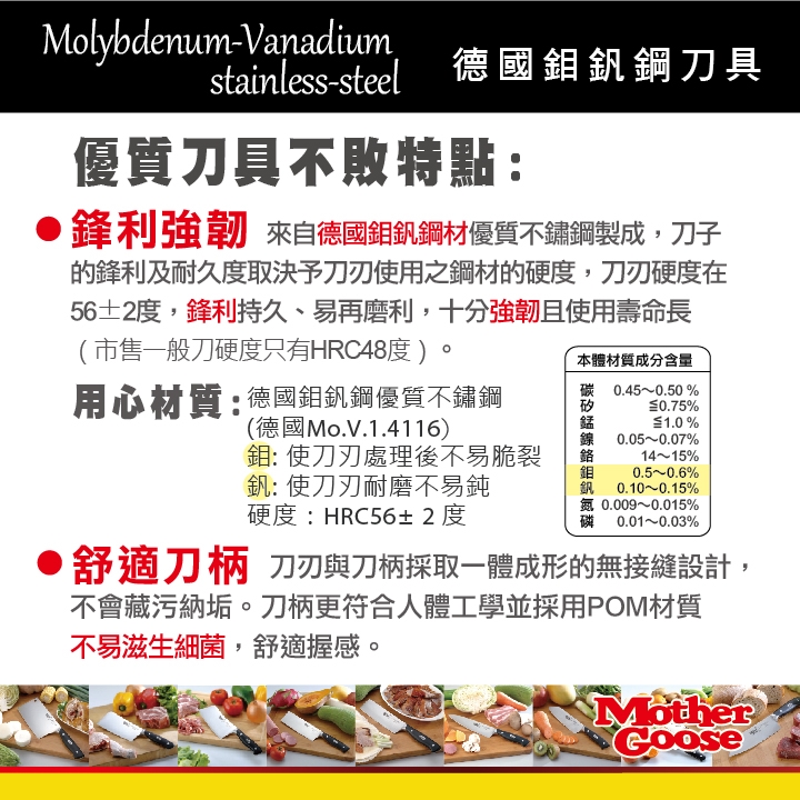 ★鋒利強韌-來自德國鉬釩鋼材優質不鏽鋼製成,刀子的鋒利及耐久度取決予刀刃使用之鋼材的硬度,刀刃硬度在56±2度,鋒利持久、易再磨利,十分強韌且使用壽命長。(市售一般刀硬度只有HRC48度)