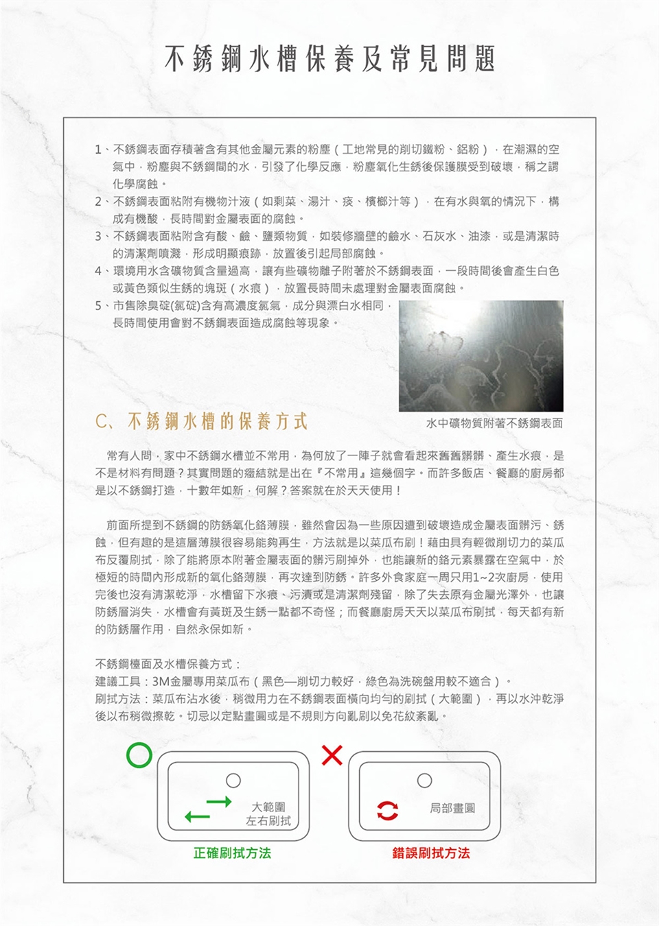 刷拭方法:菜瓜布沾水後,稍微用力在不鏽鋼表面橫向均勻的刷拭(大範圍),再以水沖乾淨後以布稍微擦乾。切忌以定點畫圓或不規則方向亂以免花紋紊亂