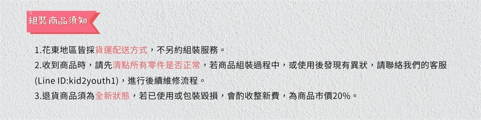 1.產品售出,經組裝後辦理退貨,因無法以正常品銷售,需酌收商品處理費(市價20%)。例:DUO椅,市價:$9700元,商品處理費$1940元(市價20%)。其它商品,如:Qmomo系列商品、兒童成長桌、成長椅..等,皆適用於此退貨原則。