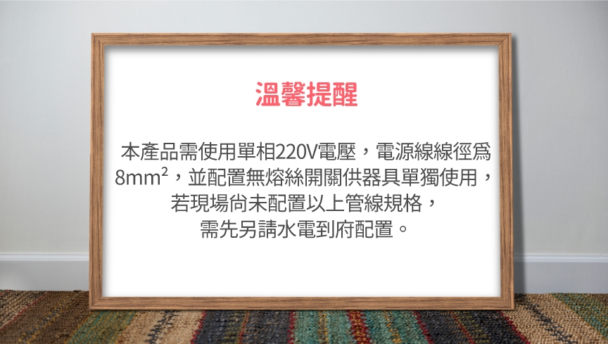 ◆基本安裝說明:僅限產品箱內包裝所附零件安裝,不含其他水電管線,如超出原箱內所附之材料需另行付費。技師無法提供挖孔洞(洗洞)、割玻璃、拆櫥櫃、水泥工程、配電線/管線及重新配線施工等服務