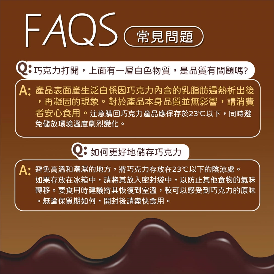 巧克力超過攝氏23度會融化,收到商品建議放置冰箱冷藏