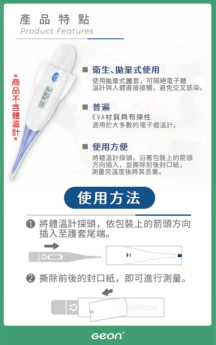 一次性使用拋棄式護套,可隔絕電子體溫計與人體直接接觸,避免交叉感染