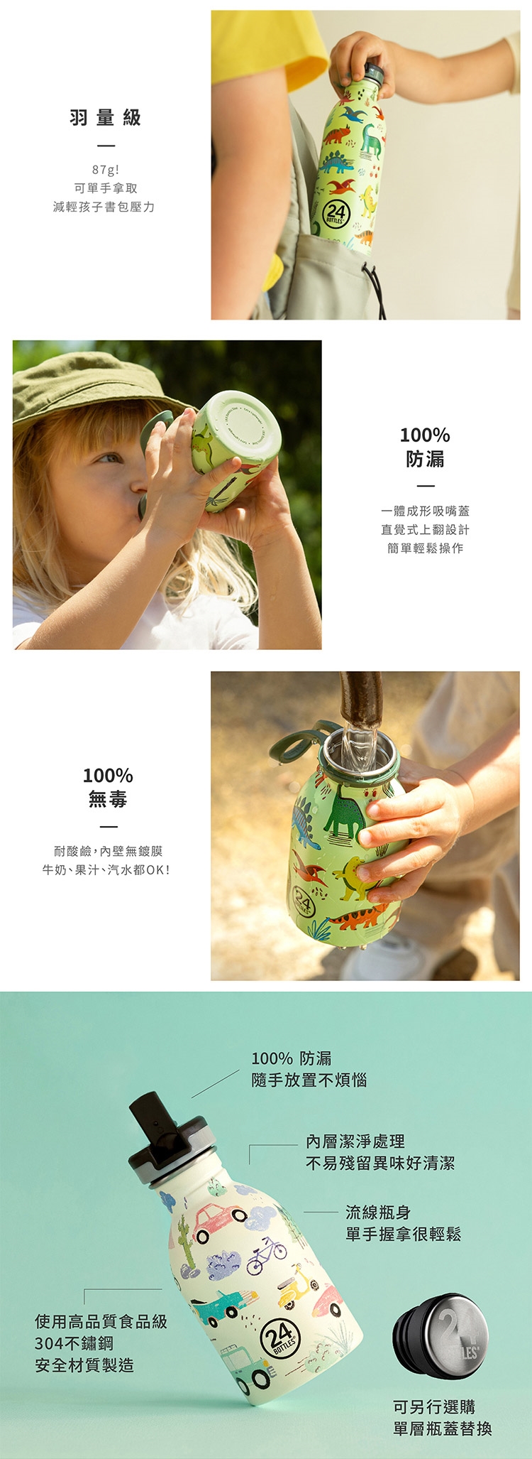 材質:水瓶 - 食品級 304 不鏽鋼、吸嘴 - 聚丙烯 (PP)