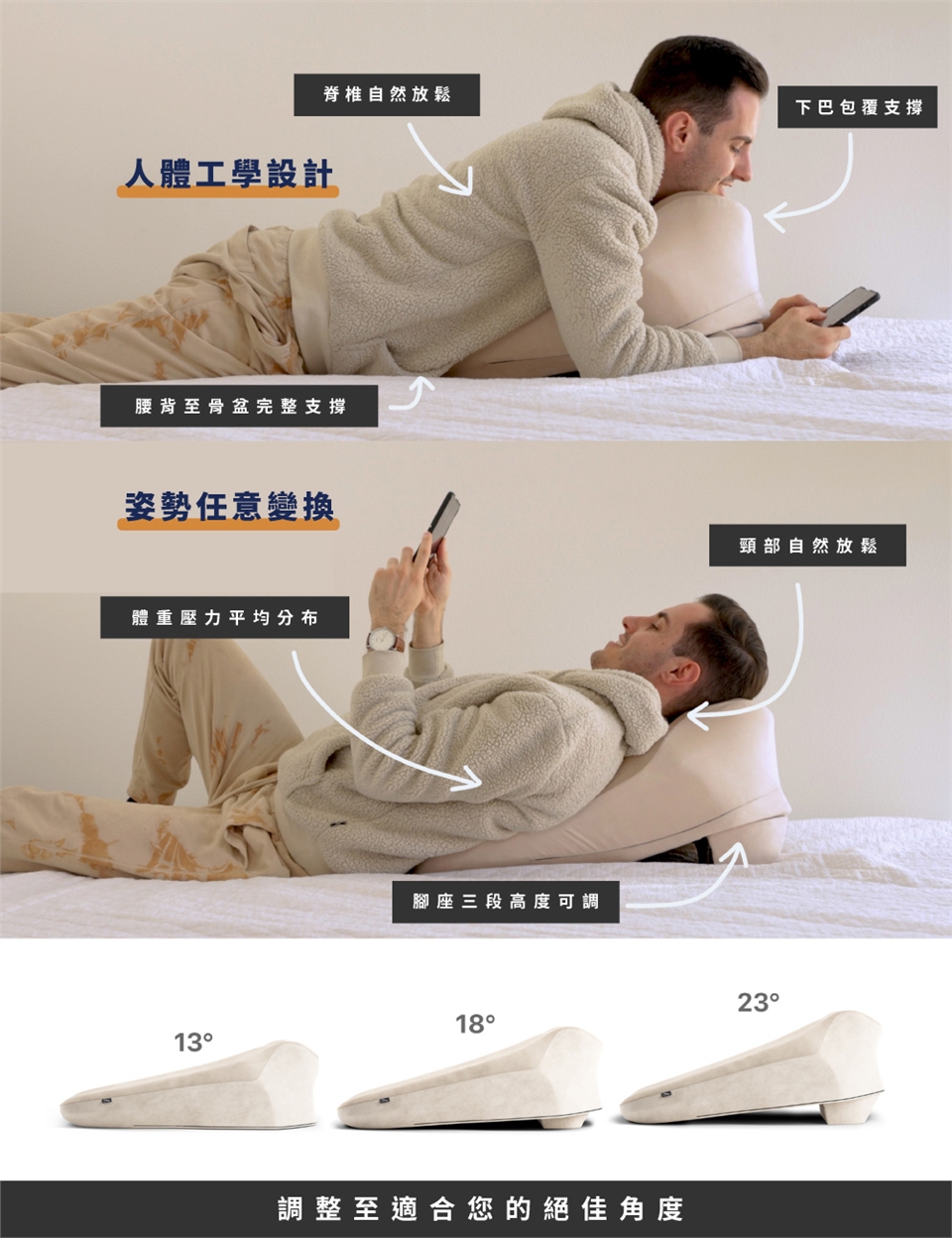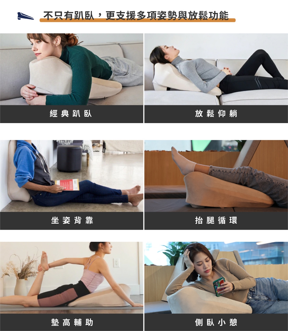 ✓趴臥、仰躺、坐靠、抬腿、運動支撐,完全支援