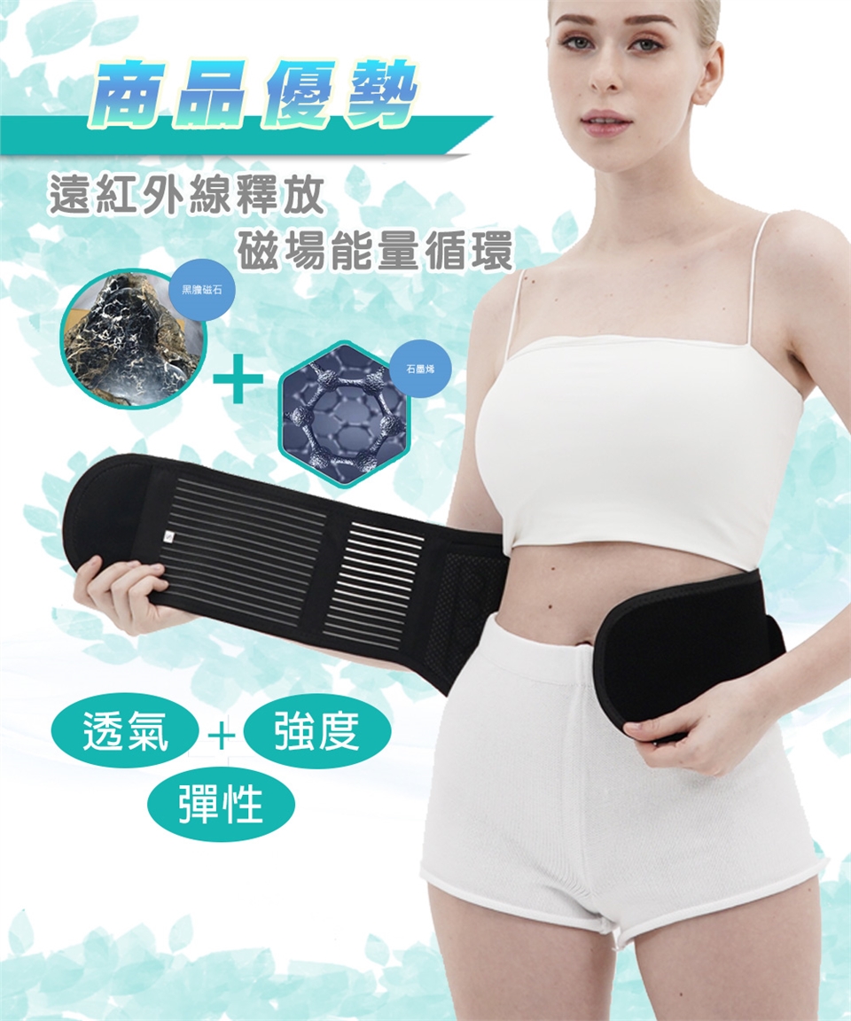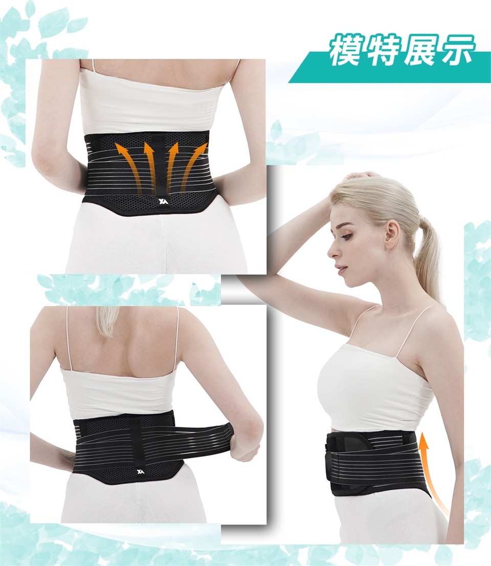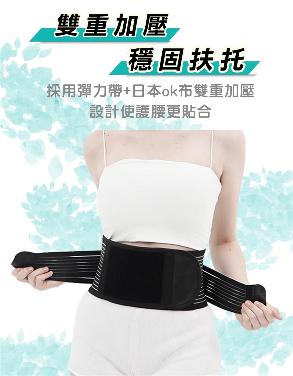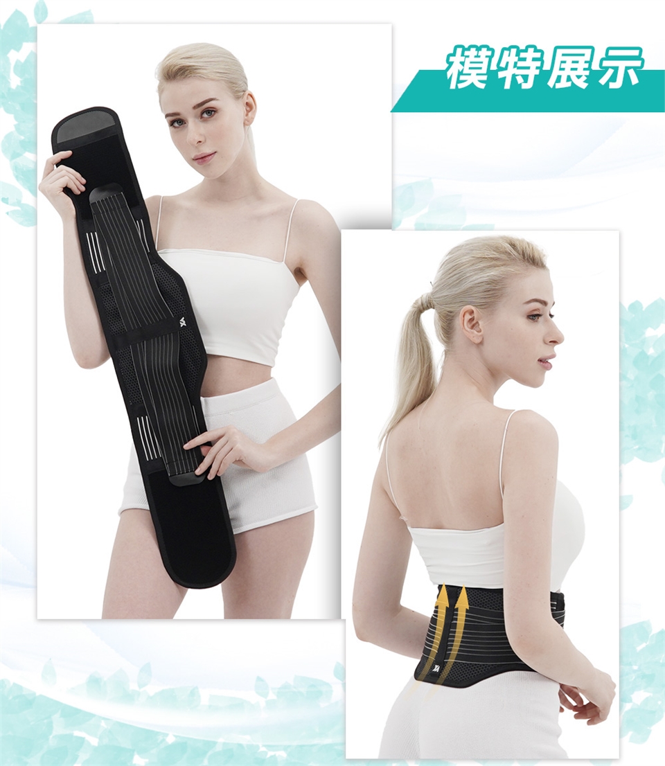 如圖所示,將護腰穿戴於腰部,再將左右兩側加壓繩黏製穿著舒適之鬆緊度,穿著期間可隨時調整。