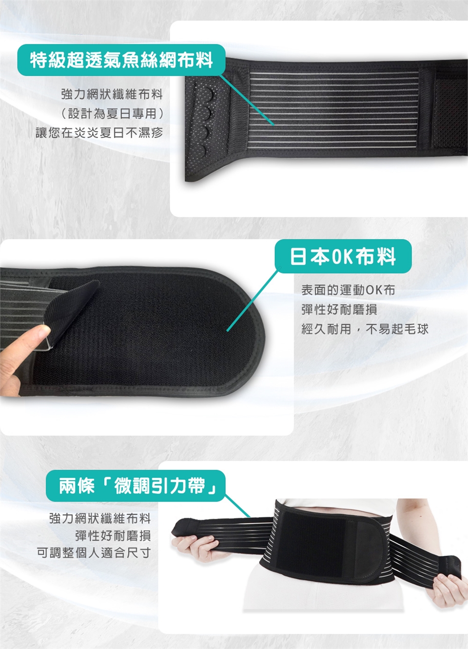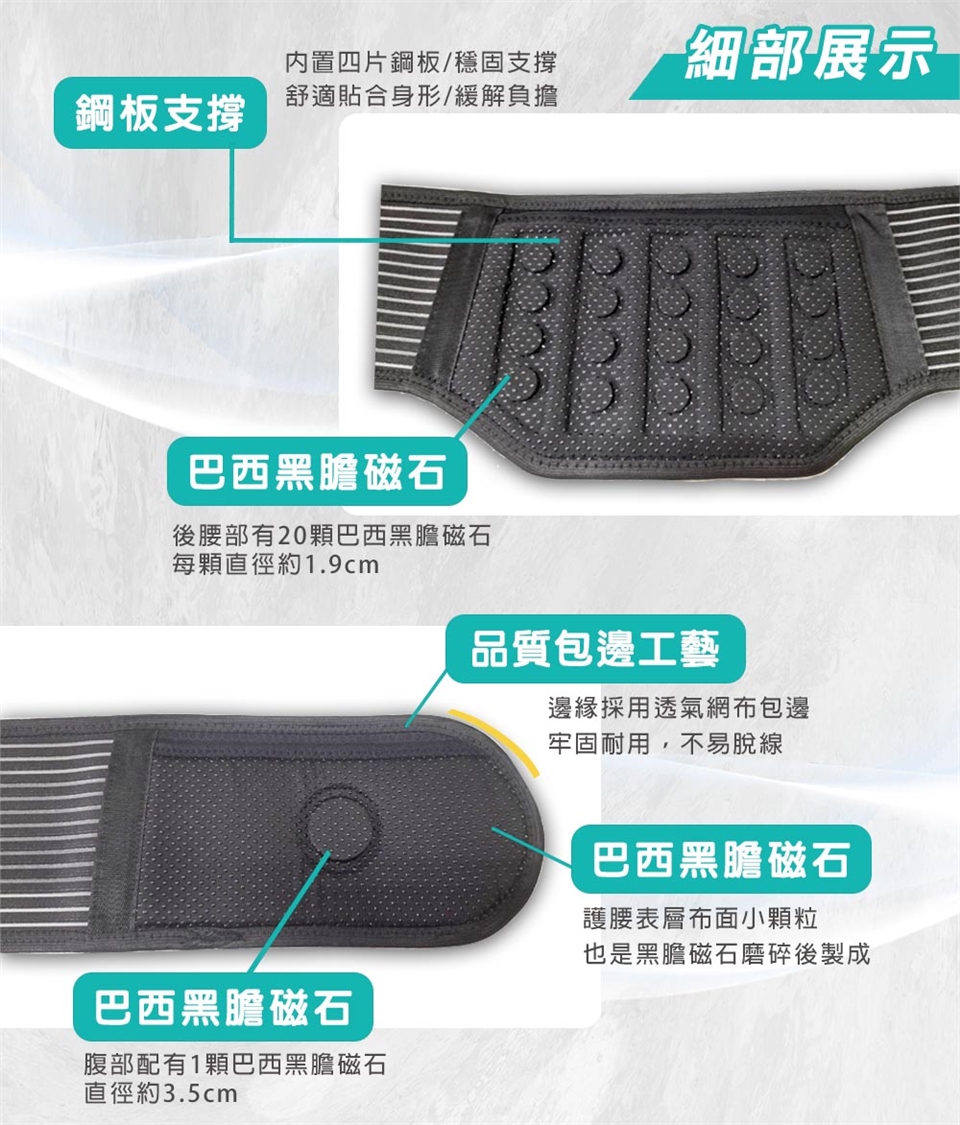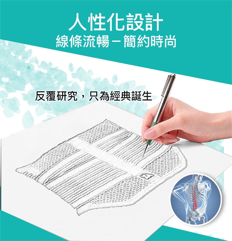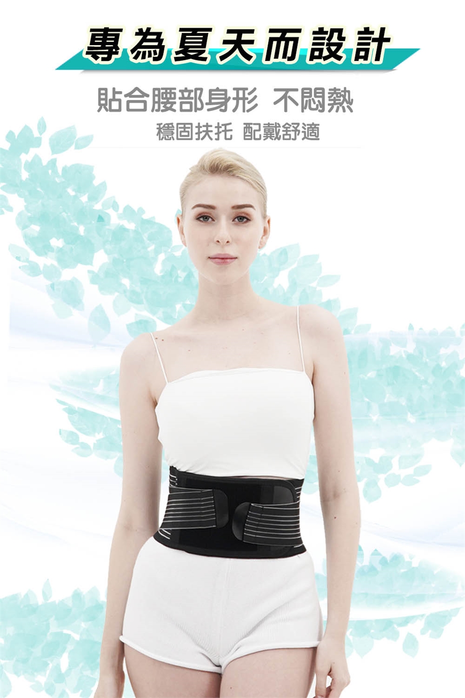 如圖所示,將護腰穿戴於腰部,再將左右兩側加壓繩黏製穿著舒適之鬆緊度,穿著期間可隨時調整。