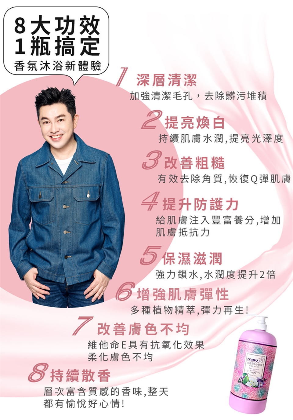 沾濕身體,取適量沐浴乳至手心上,直接塗抹於肌膚至起泡,再略加按摩達到深度清潔,再以清水洗淨。