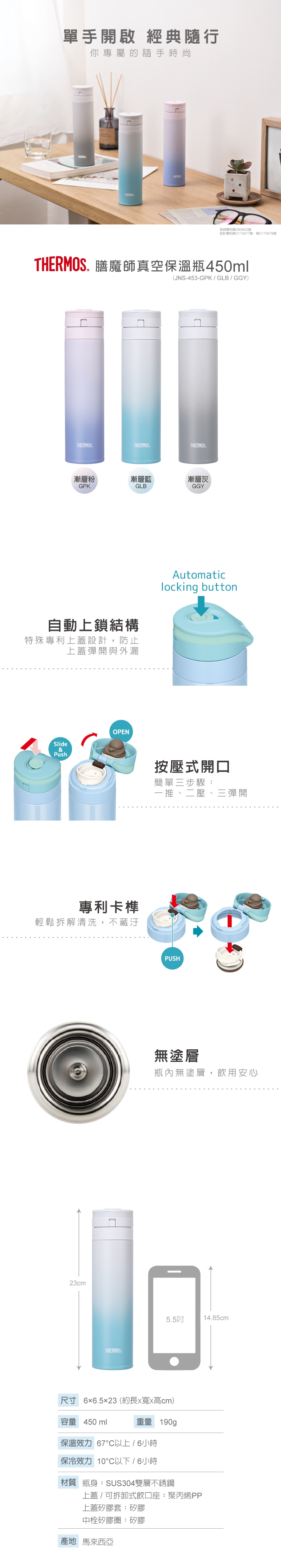 THERMOS膳魔師超輕量自動上鎖彈蓋不鏽鋼真空保溫瓶450ml(JNS-453)(漸層系列) |