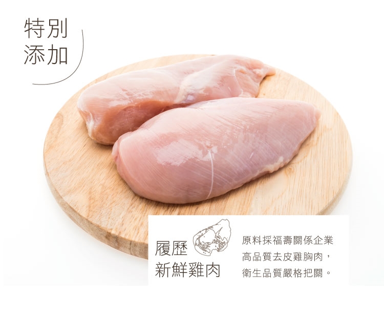 ◆ 肉塊成分:履歷去皮雞胸肉、非基改大豆蛋白、小麥粉、omega3芥花油、維他命E、綜合維生素
