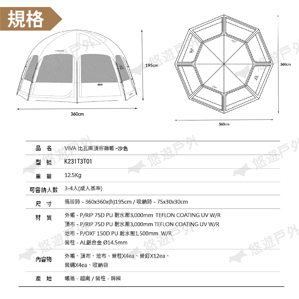 【悠遊戶外】KZM VIVA比瓦圓頂客廳帳 沙色