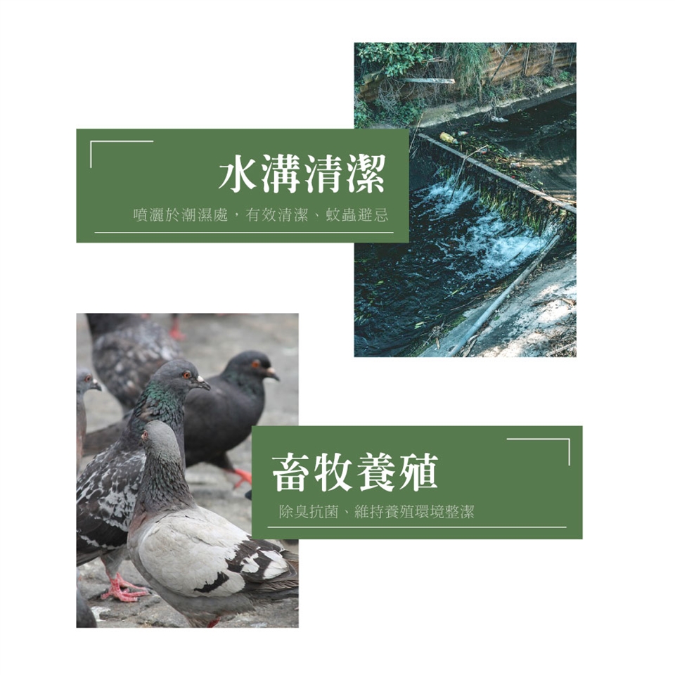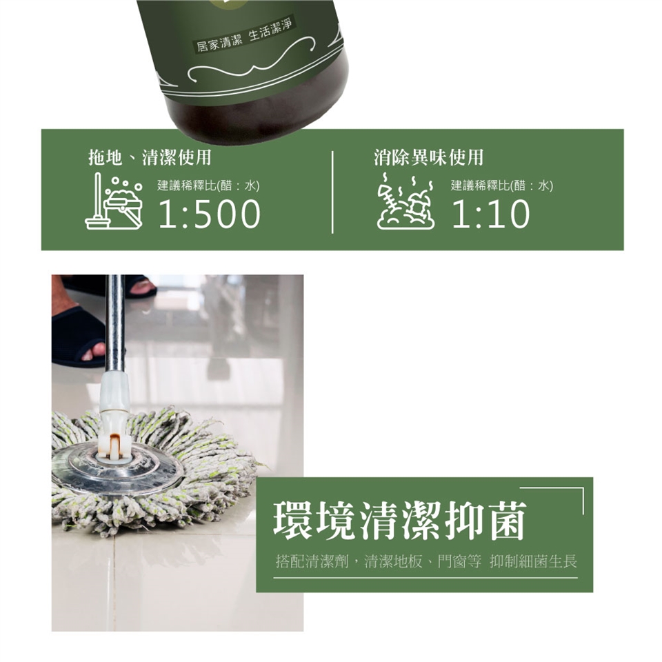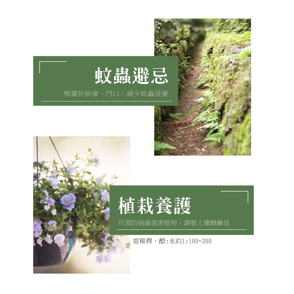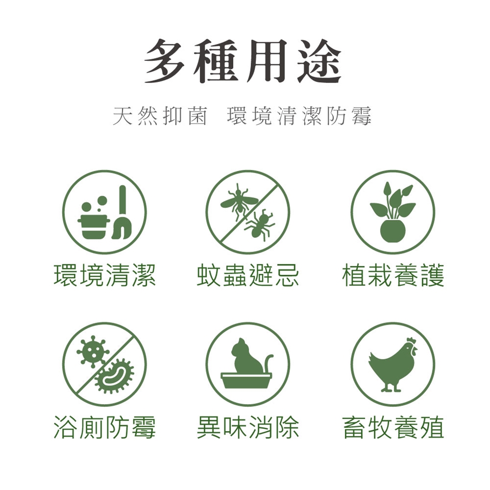 以100~500倍稀釋,用於居家清潔、拖地、浴廁防霉清潔。噴灑於紗窗、門口,減少蚊蟲侵擾。