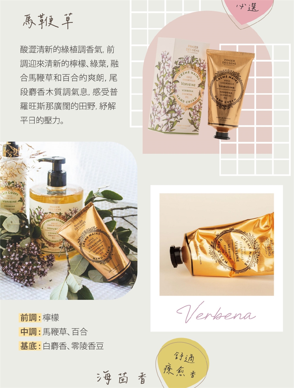 馬鞭草: 前調:檸檬、中調:馬鞭草.百合、基調:白麝香.零陵香豆