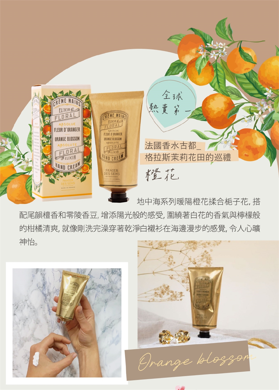 橙花: 前調:柑橘、中調:橙花.梔子花、基調: 檀香.零陵香豆.香草