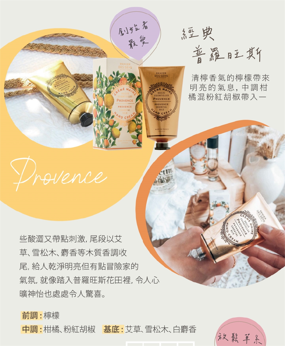 經典普羅旺斯: 前調:檸檬、中調:柑橘.粉紅胡椒、基調:艾草.雪松木.白麝香
