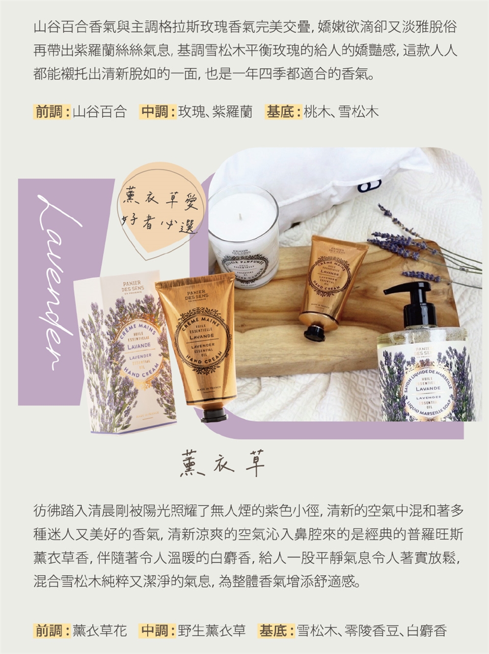 薰衣草: 前調:薰衣草花、中調:野生薰衣草、基調:雪松木.零陵香豆.白麝香
