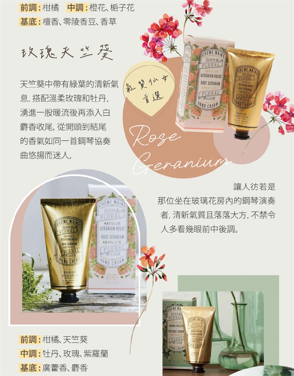 玫瑰天竺葵: 前調:柑橘.天竺葵、中調:牡丹.玫瑰.紫羅蘭、基調:廣藿.麝香