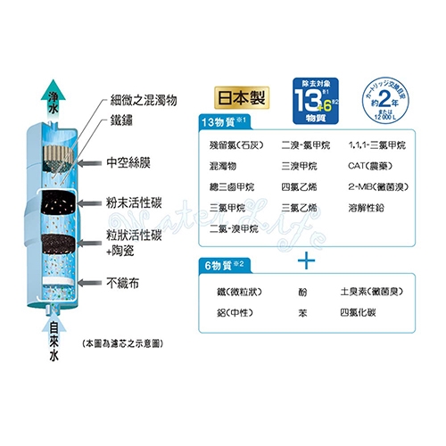 ◎可去除物質可去除13種+6有害物質:殘留氯,污濁物,總三鹵甲烷,三氯甲烷,二氯一溴甲烷,二溴一氯甲烷,三溴甲烷,四氯乙烯,三氯乙烯,1,1,1-三氯乙烷,CAT(農藥),2-MIB(黴菌臭),溶解性鉛,鐵(微粒形成),鋁(中性),土臭素(黴菌臭),酚,苯,四鹽化炭素