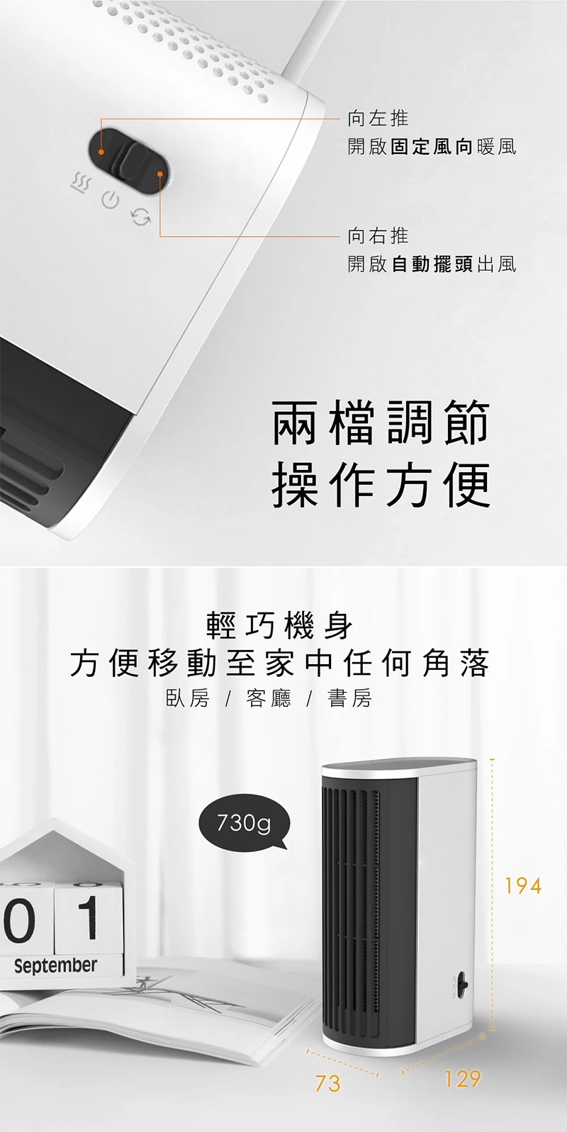 ➤日系簡約外型,機身輕巧,可立、臥擺放,方便移動至家中任何角落