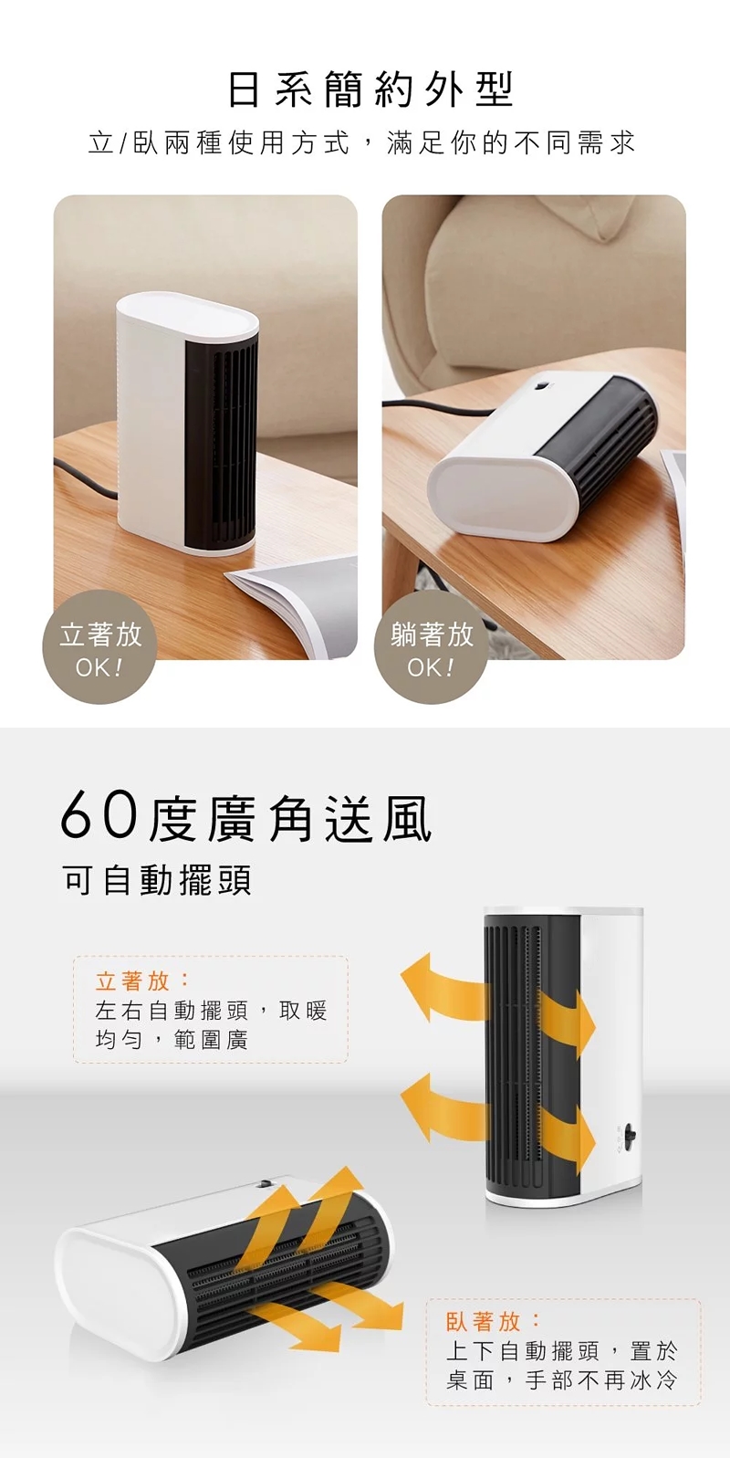 ➤可自動擺頭,60度廣角送風,暖風均勻分散至各個角落
