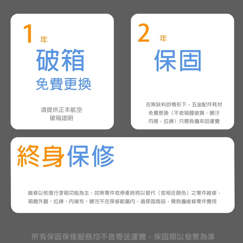 (1) 網路購買之行李箱保固依照網頁標示,保固以收到商品隔日起算。