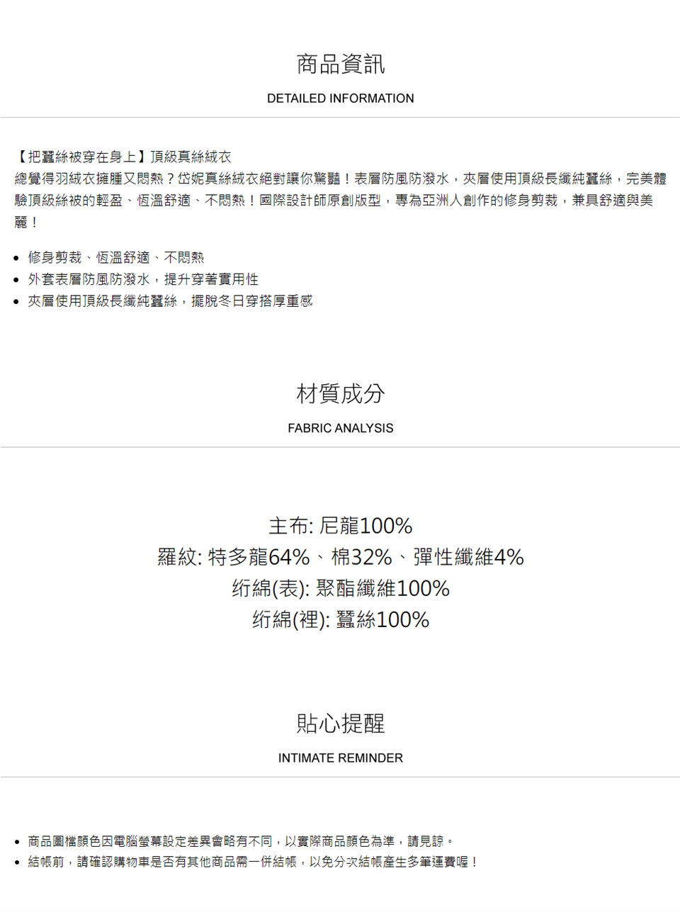 ► 請避免於太陽直射處曝曬,避免蠶絲纖維損壞。