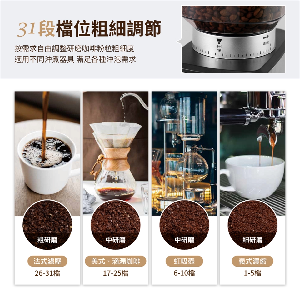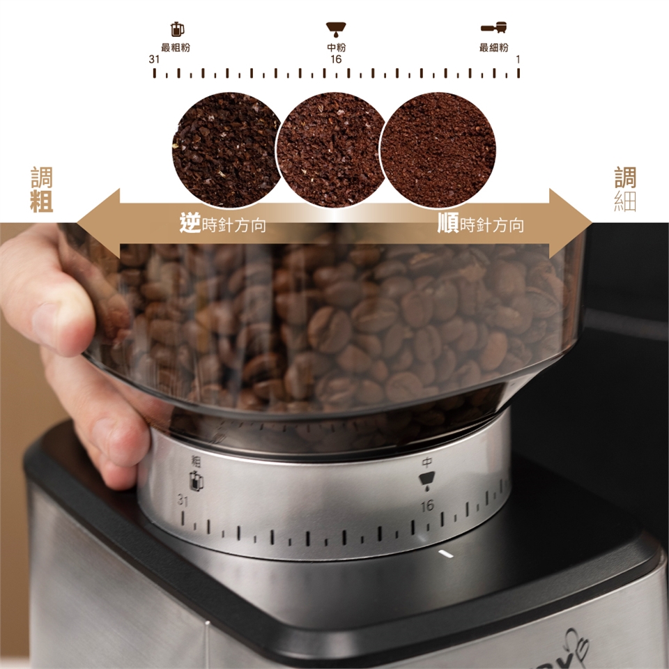 精確調校:具有31段研磨設定,可以根據您的需求調整到最佳的磨豆粗細度,為每一杯咖啡提供完美的口感。
