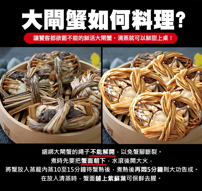 煮時先要把蟹面朝下,水滾後開大火,將蟹放入蒸籠內蒸10至15分鐘待蟹熟後,