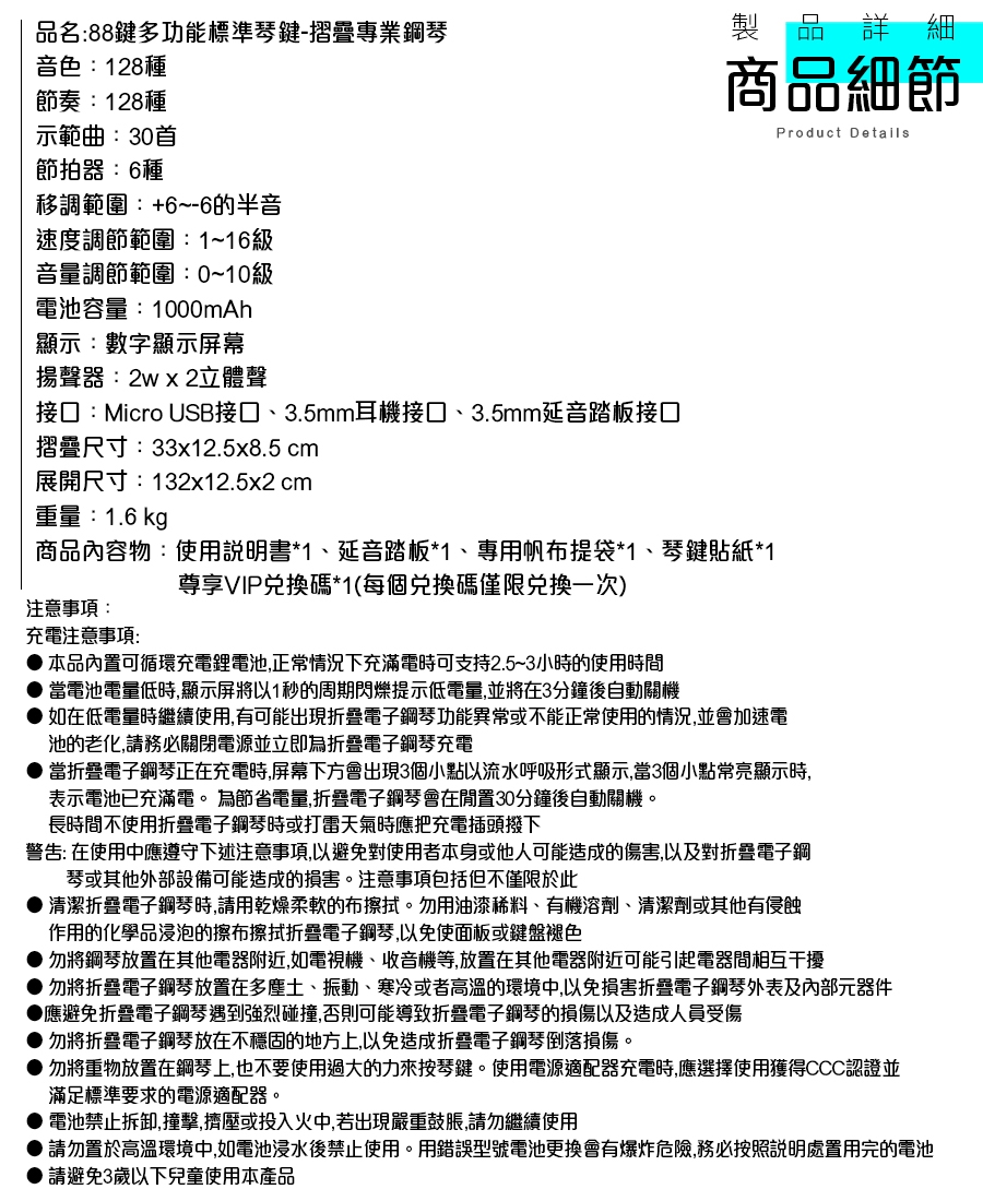 ●如在低電量時繼續使用,有可能出現折疊電子鋼琴功能異常或不能正常使用的情況