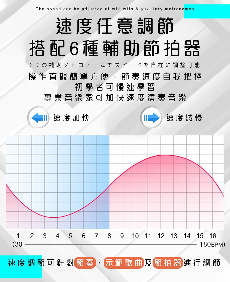 【多種搭配】擁有128種音色、128首節奏並內建30首示範曲目外加6種類型節拍器