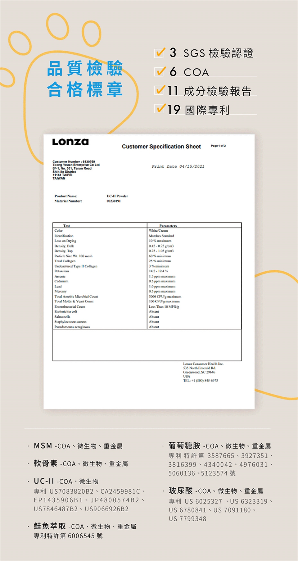 包裝重量:64g 材質:葡萄糖胺鹽酸鹽、MSM(甲基硫醯基甲烷、鯊魚軟骨素、維生素C、薑黃素、雞胸軟骨萃取(含玻尿酸)、膠原 蛋白複合物(含非變性二型膠原蛋白)、鮭