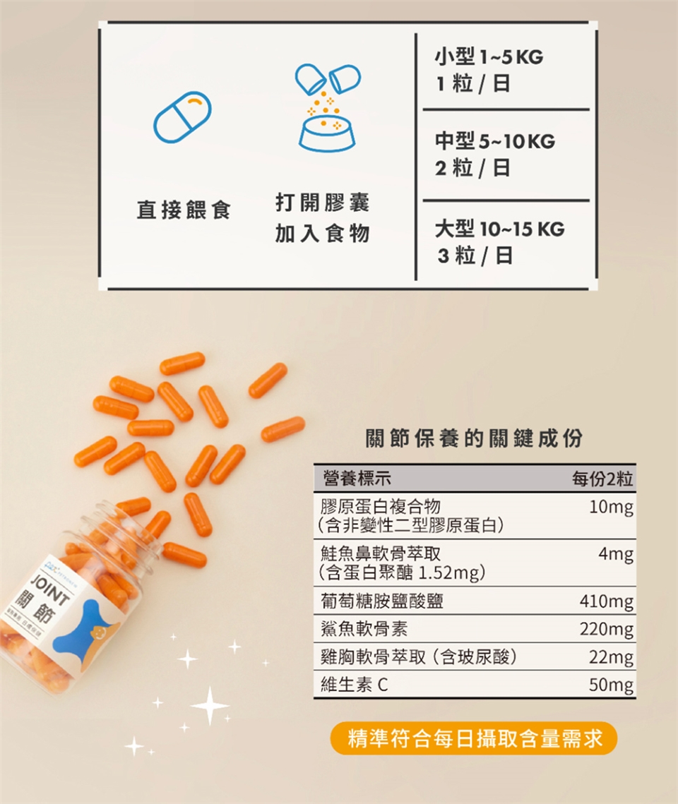 每日建議餵食量(以5公斤為單位):小型1-5kg 1粒/日、 中型5-10kg 2粒/日、 大型10-15kg 3粒/日
