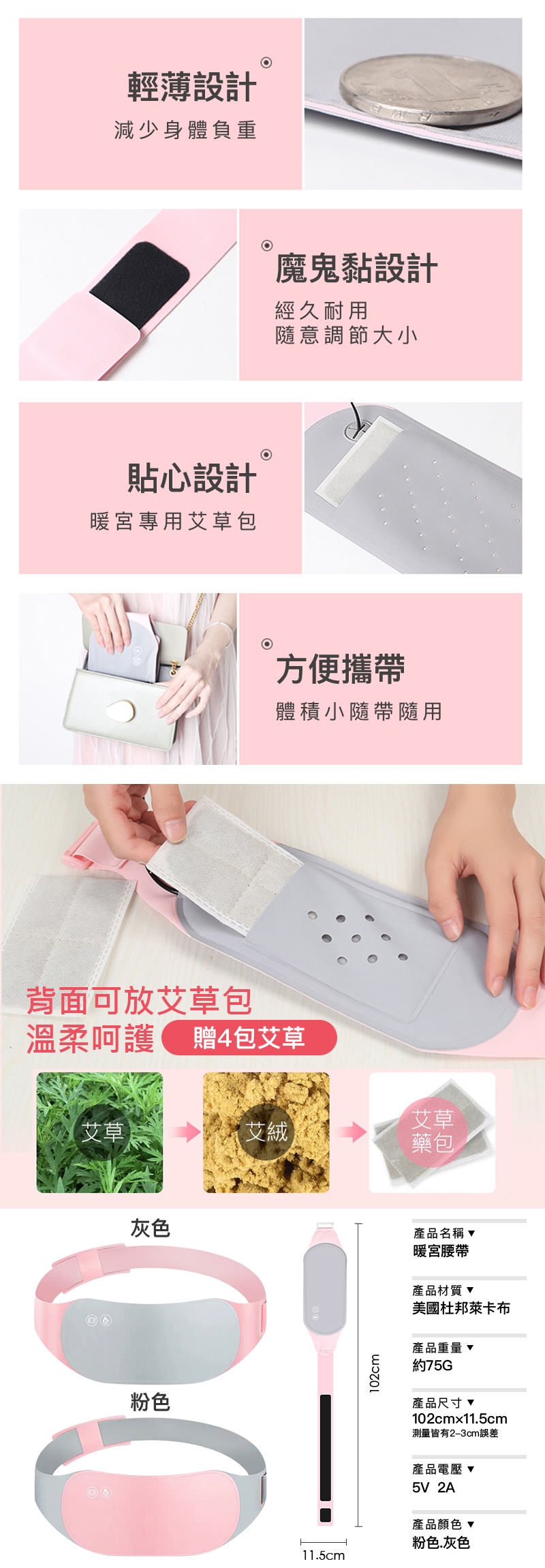 .配件:暖宮腰帶x1、艾草包x4、延長線x1、行動電源袋(無附贈行動電源)