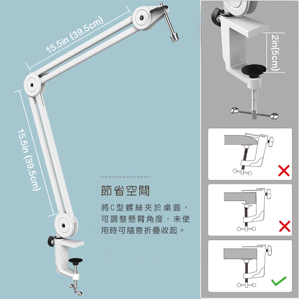 懸臂上的麥克風支架採通用5/8”螺紋,適用市面上大部分的麥克風。