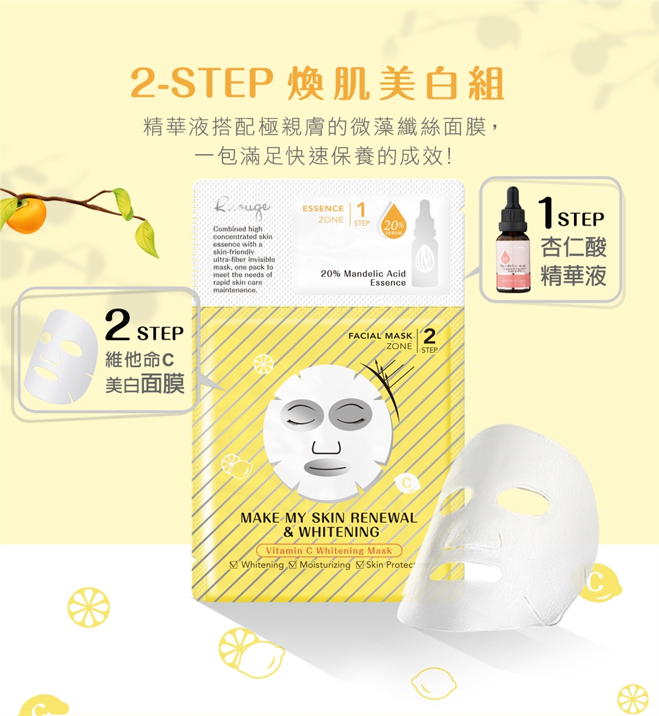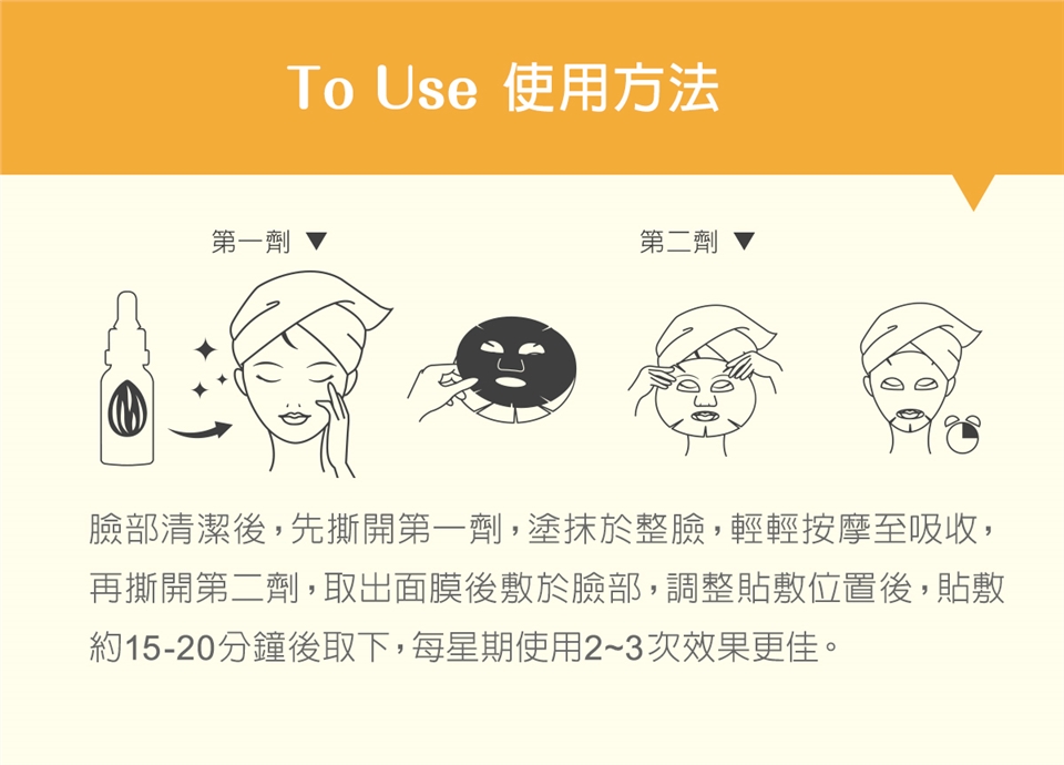打開步驟一內的杏仁酸精華液,均勻塗抹於臉上等待肌膚吸收後,打開步驟二的面膜從眼部開始貼合敷上面膜,慢慢地延展到整個臉部,使其充分貼合。
