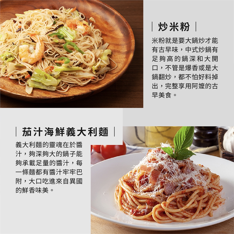 ※加厚鑄鋁鍋底可快速導熱,受熱均勻不需熱鍋養