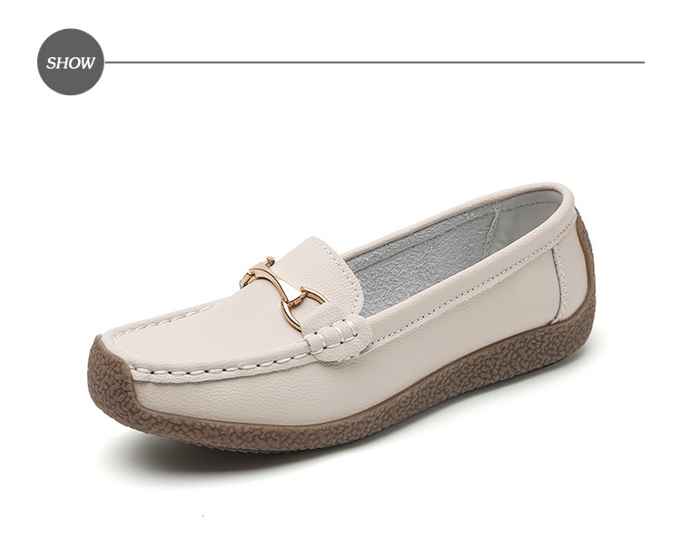 【MOM】樂福鞋 休閒樂福鞋/真皮經典釦飾百搭軟底休閒樂福鞋 米