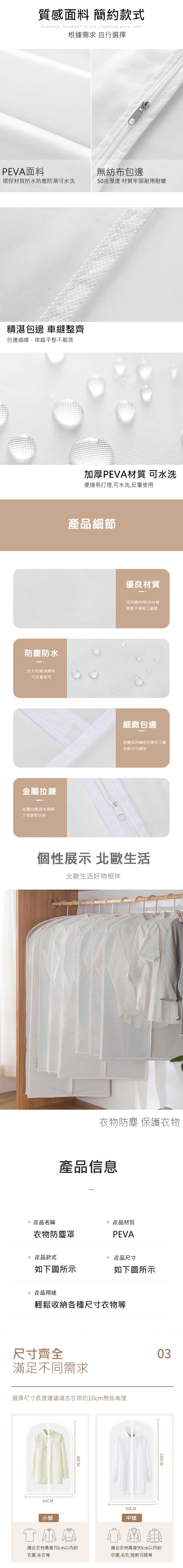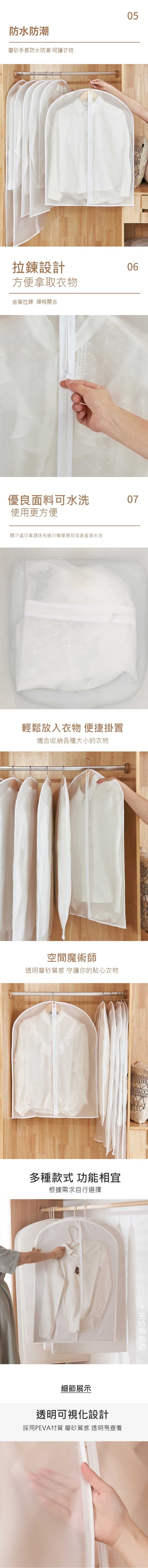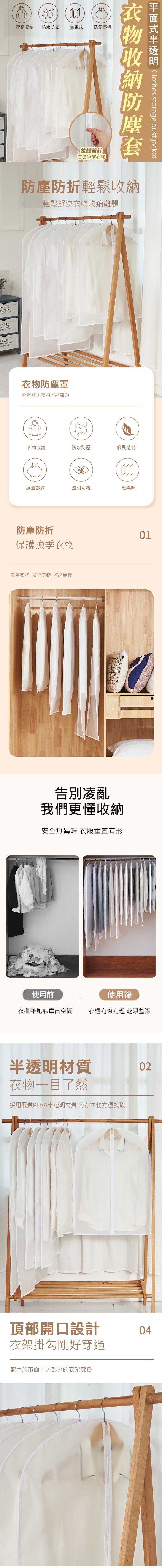 長期懸掛的衣物容易擠滿灰塵,平面式半透明衣物收納防塵套,有效防水防潮,採用PEVA材質無異味可水洗,磨砂質感透明可視化設計方便拿取衣物,簡約款式,精湛包邊,車縫整齊平整不脫落材質牢固耐用,金屬拉鏈開合順暢,頂部衣架開口設計,方便吊掛衣物,輕鬆收納省空間