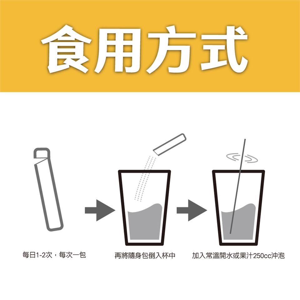 每天三次,每次一包,可加入常溫開水或果汁250cc沖泡