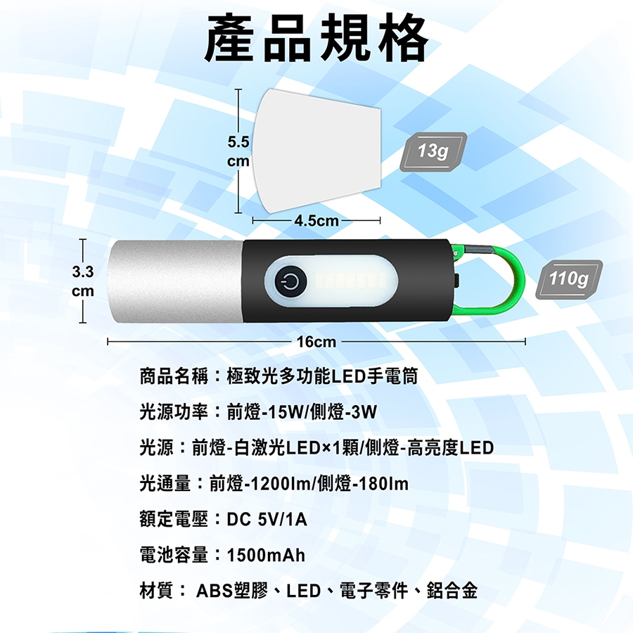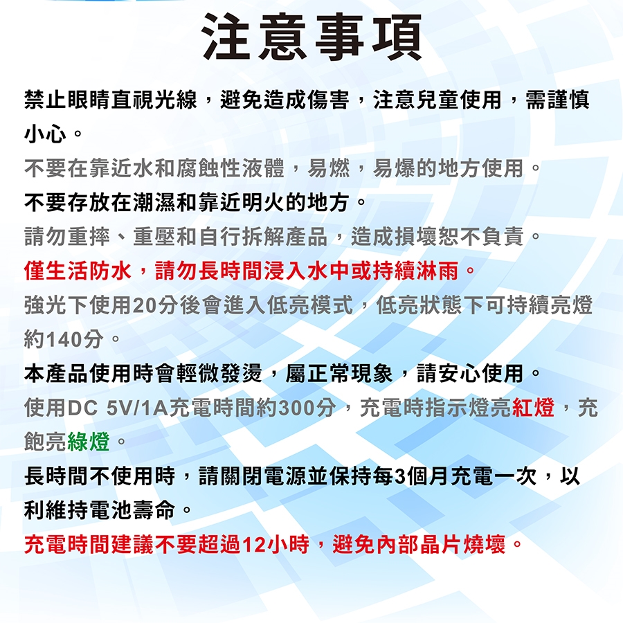 6.強光下使用20分後會進入低亮模式,低亮狀態下可持續亮燈約140分。