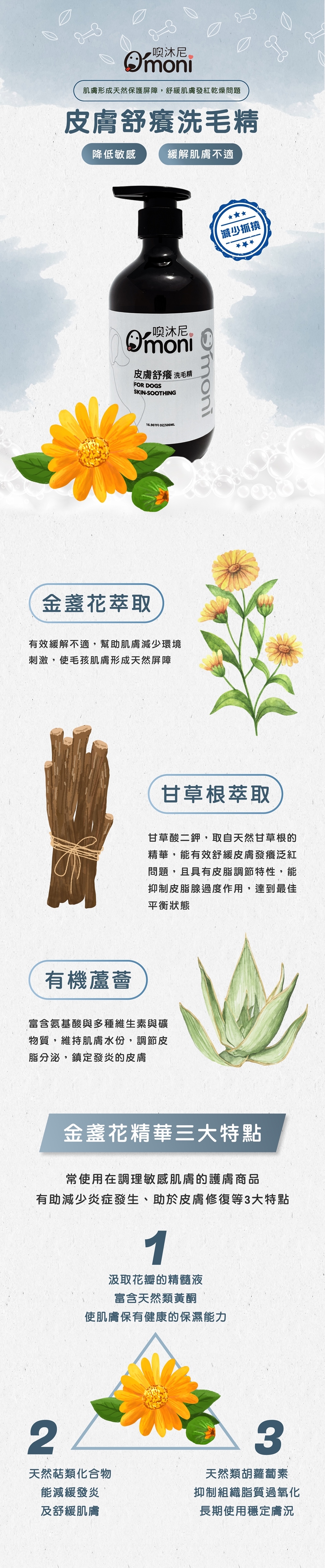 金盞花富含天然抗氧化劑、類黃酮、多酚和類胡蘿蔔素,有助於降低敏感性並緩解刺激.