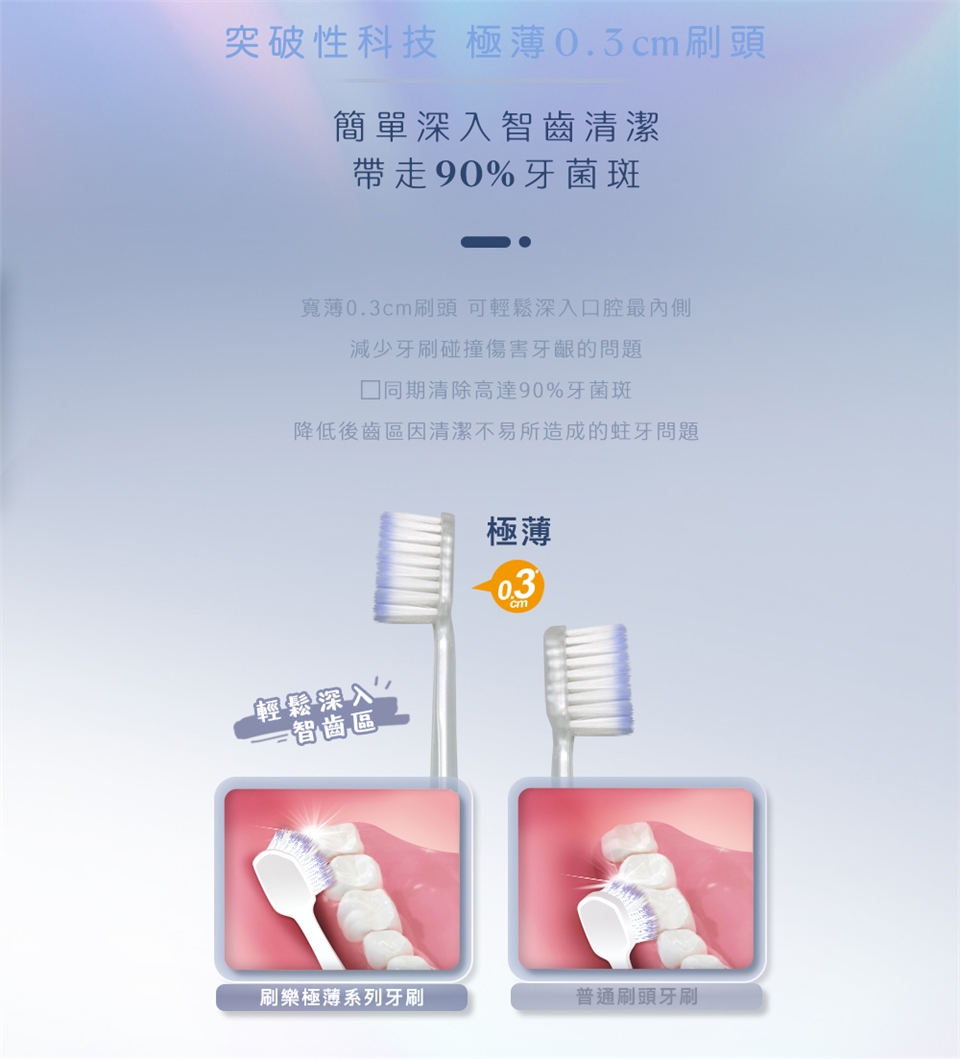 請配合正確刷牙習慣,並2-3個月更換新牙刷,以免刷毛彈性降低、細菌孳生,影響口腔健康。