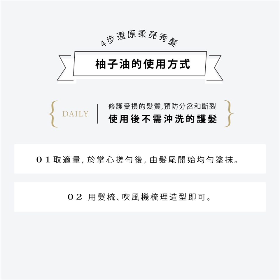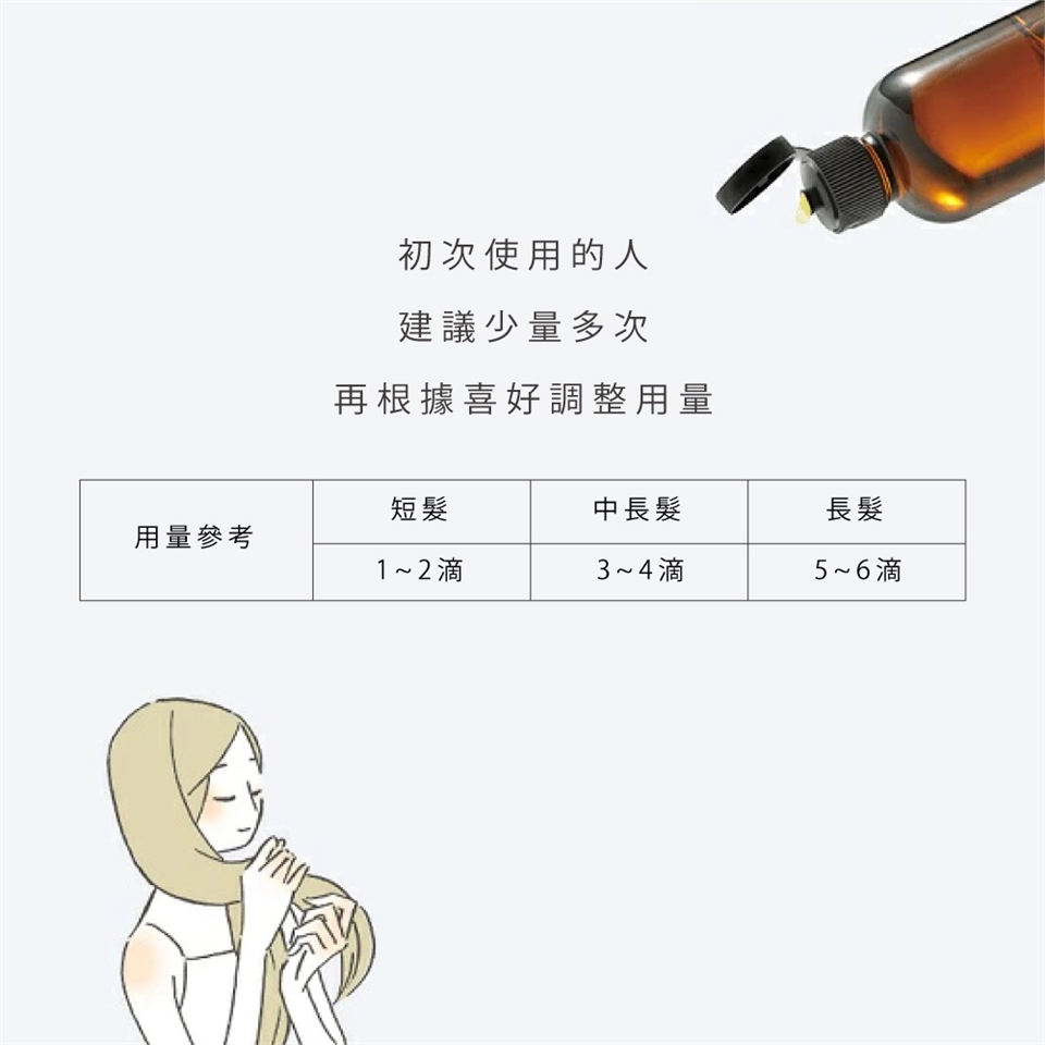 1. 免沖洗護髮精華:取數滴於掌心搓揉,以髮尾為主,於半乾的髮絲上均勻塗抹。