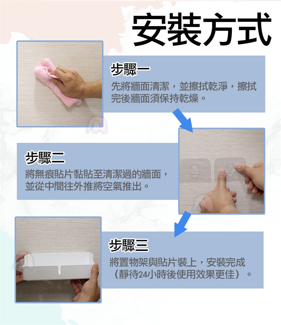 黏貼貼片前,請先將黏貼的牆壁面擦拭乾淨,擦拭乾淨後再黏貼貼片,黏貼貼片必須將貼片內的空氣向外擠出,靜待3小時以上後在掛上置物架。
