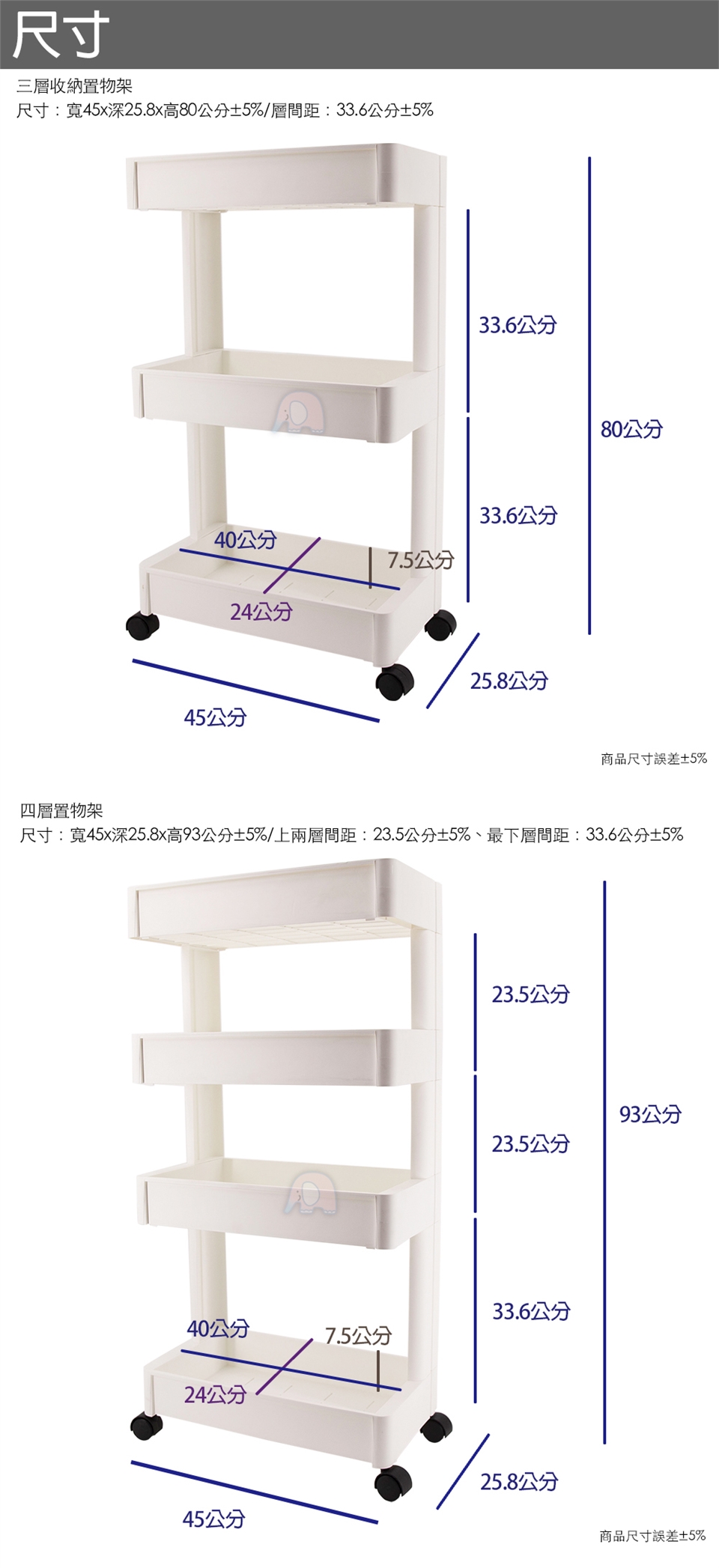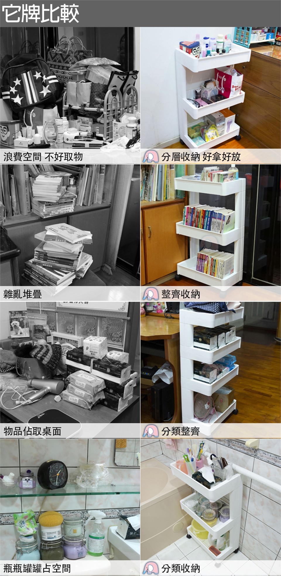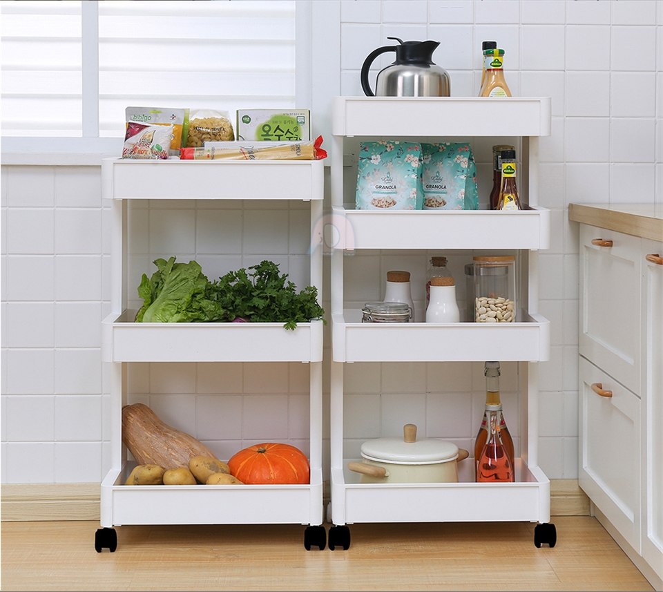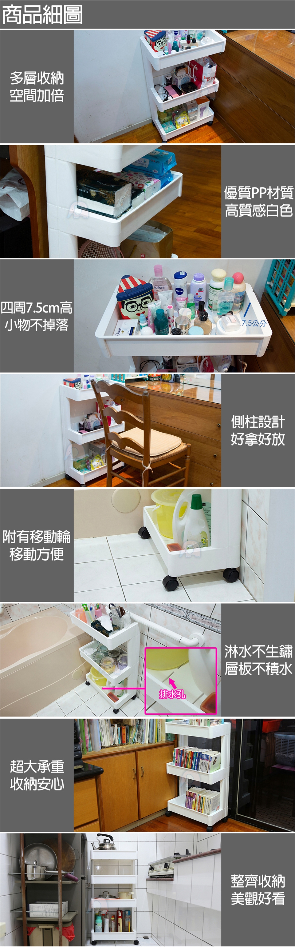 側邊支柱收納取物,可放置瓶瓶罐罐或物品收納,底部有移動輪可移動。