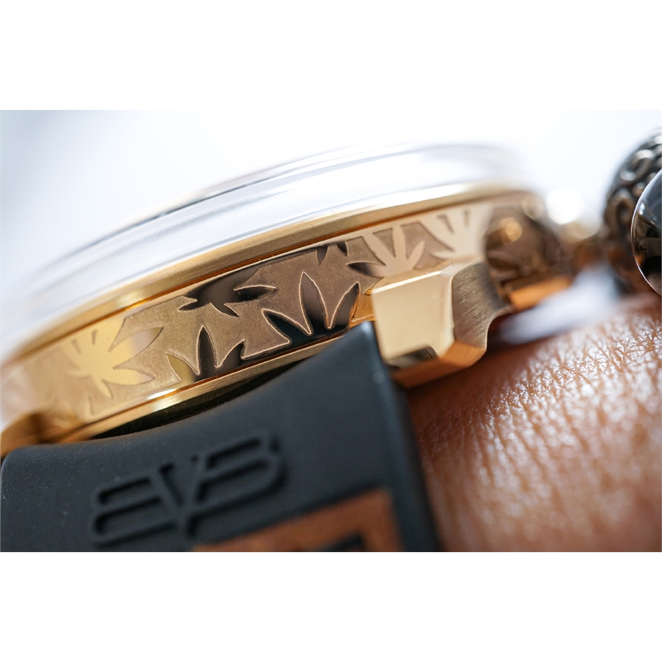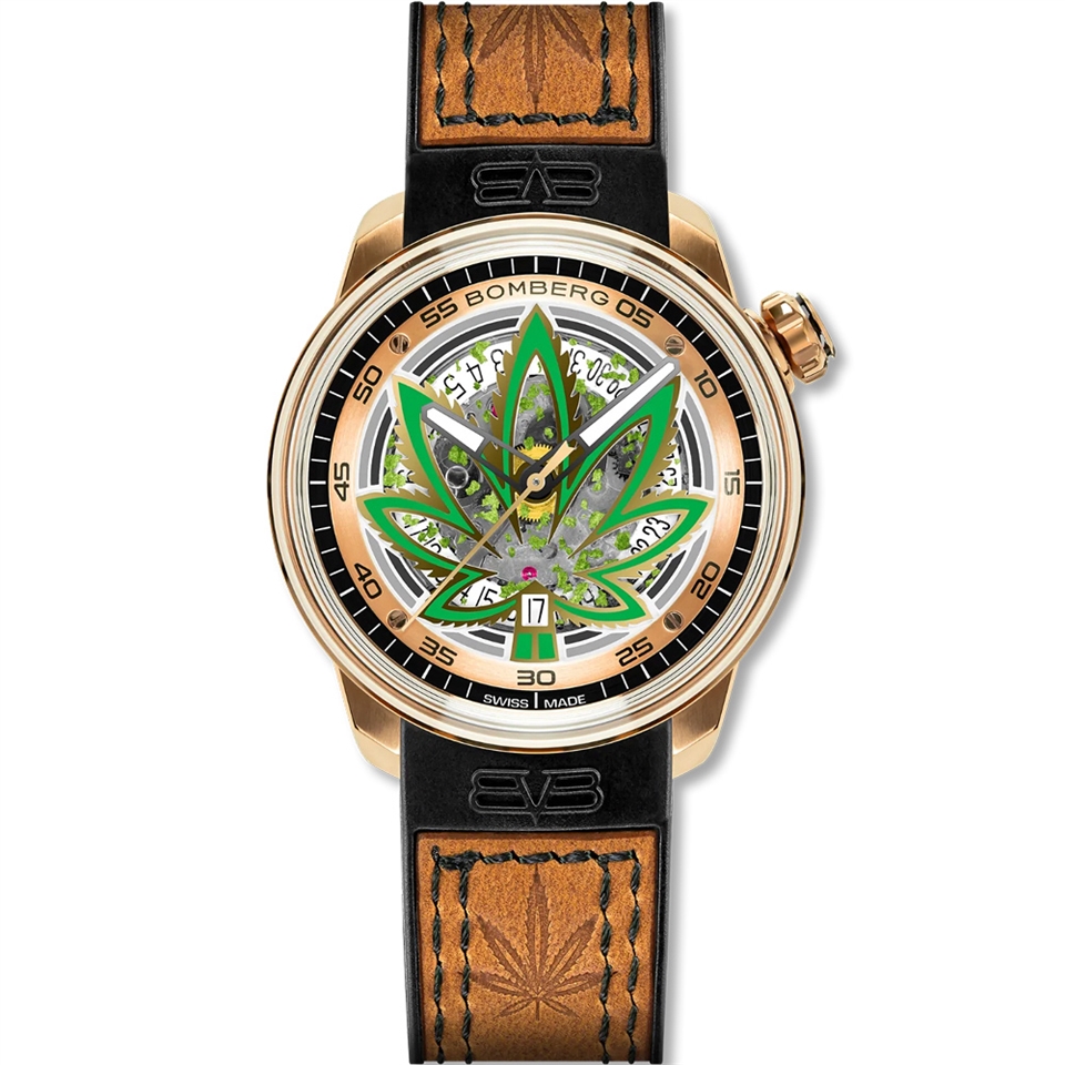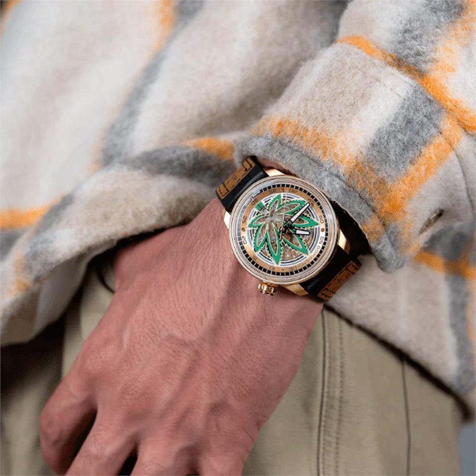 時、分、秒大三針顯示,外側錶殼飾以大麻葉圖案
