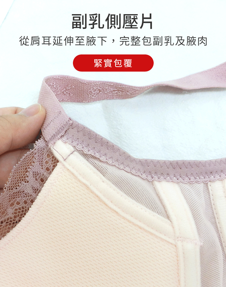 副乳側壓片,肩耳延至腋下,緊實包覆副乳腋肉