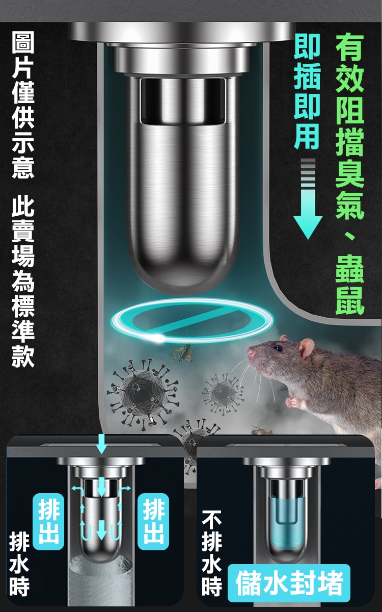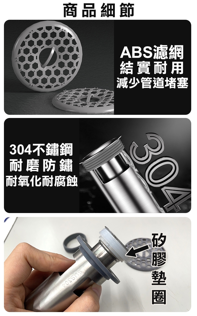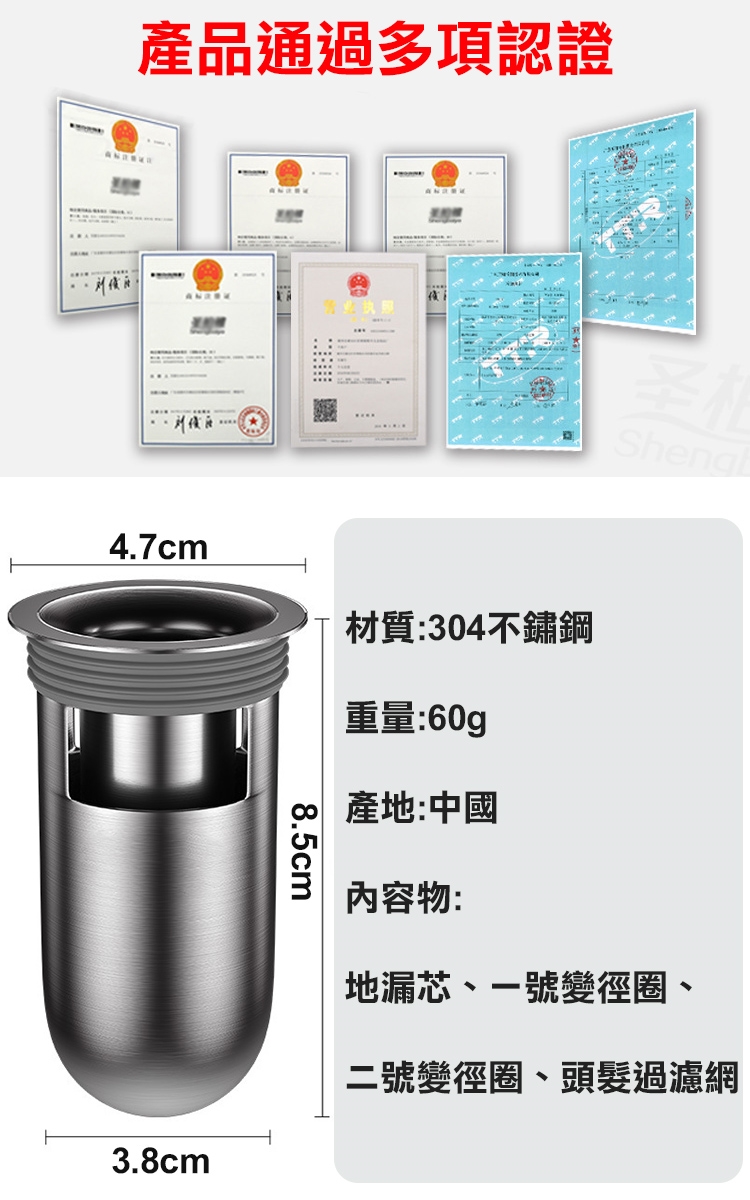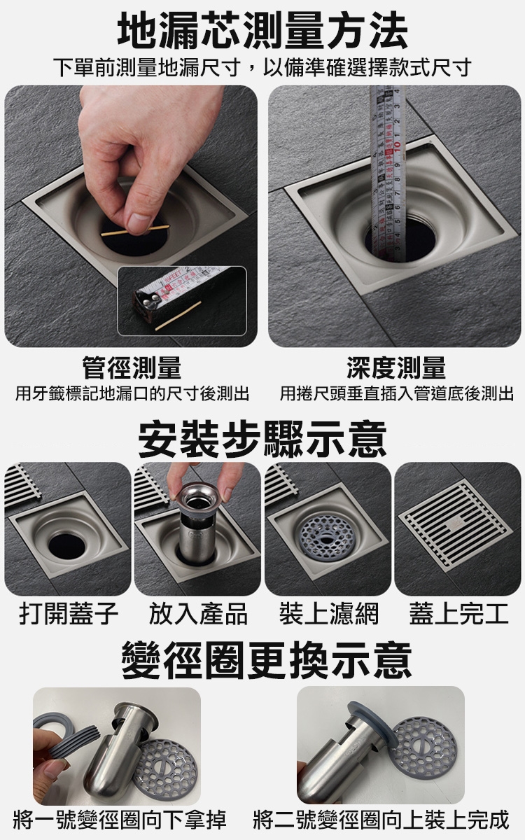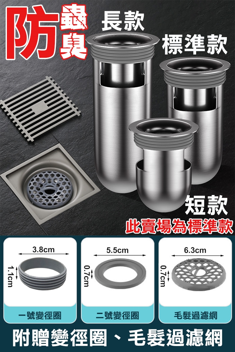 內容物:地漏芯x1、一號變徑圈x1、二號變徑圈x1、頭髮過濾網x1