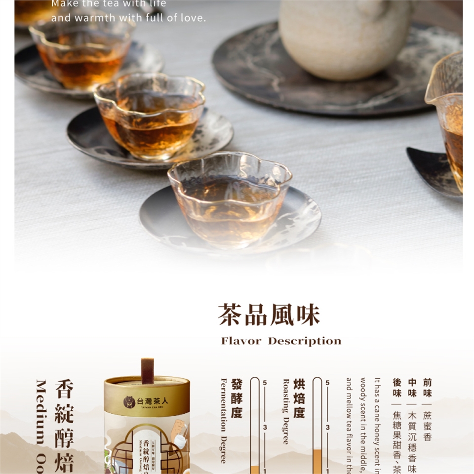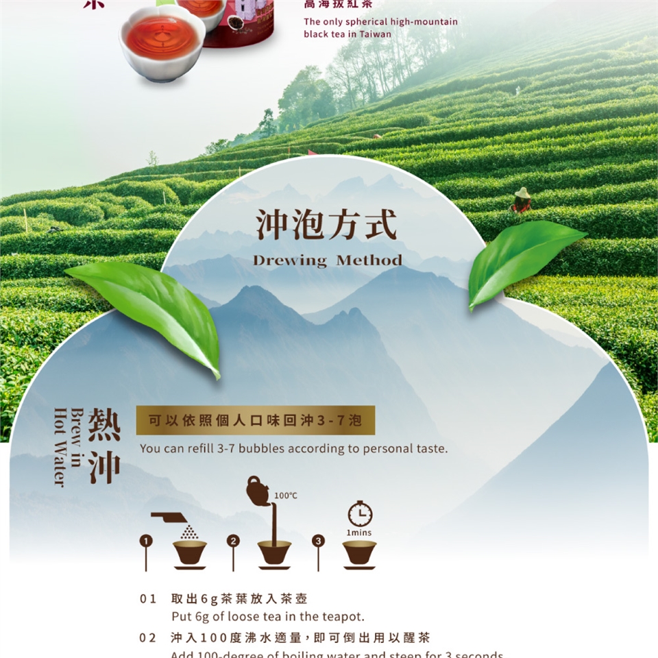 *熱沖:取出6g茶乾至入茶壺,沖入90度300cc熱水旋即倒掉以醒茶,第一泡或第二泡停留45~50秒,即為最佳風味時間,可依個人口味回沖3~7泡。